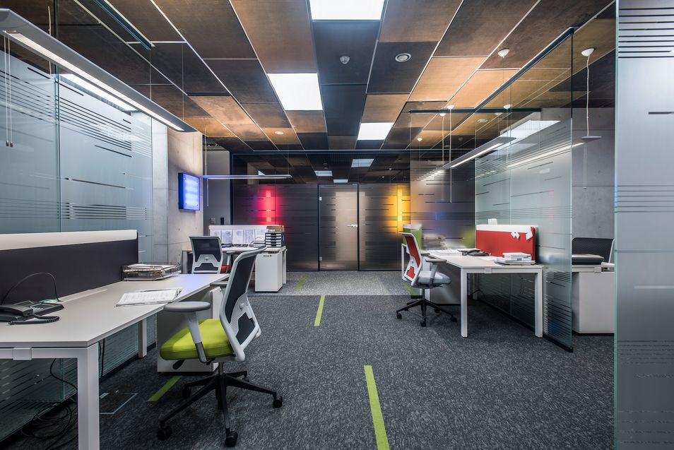 Jaki jest największy problem projektowy? Ucieczka od standardów bezpiecznego projektowania z założeniem, że projekt ma być ponadczasowy. Niezwykle istotny jest odpowiedni dobór kolorystyki, mebli i oświetlenia biura. W takim przypadku, w przestrzeniach stworzonych do pracy, zastosowanie intensywnych kolorów jest bardzo ryzykowne. Dlatego warto zagrać jedynie pojedynczymi elementami, fragmentami oraz detalami, które wyłaniają się z monochromatycznych brył, betonowych surowych ścian filarów, podłóg i sufitów.