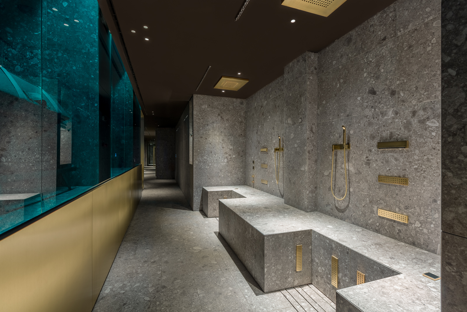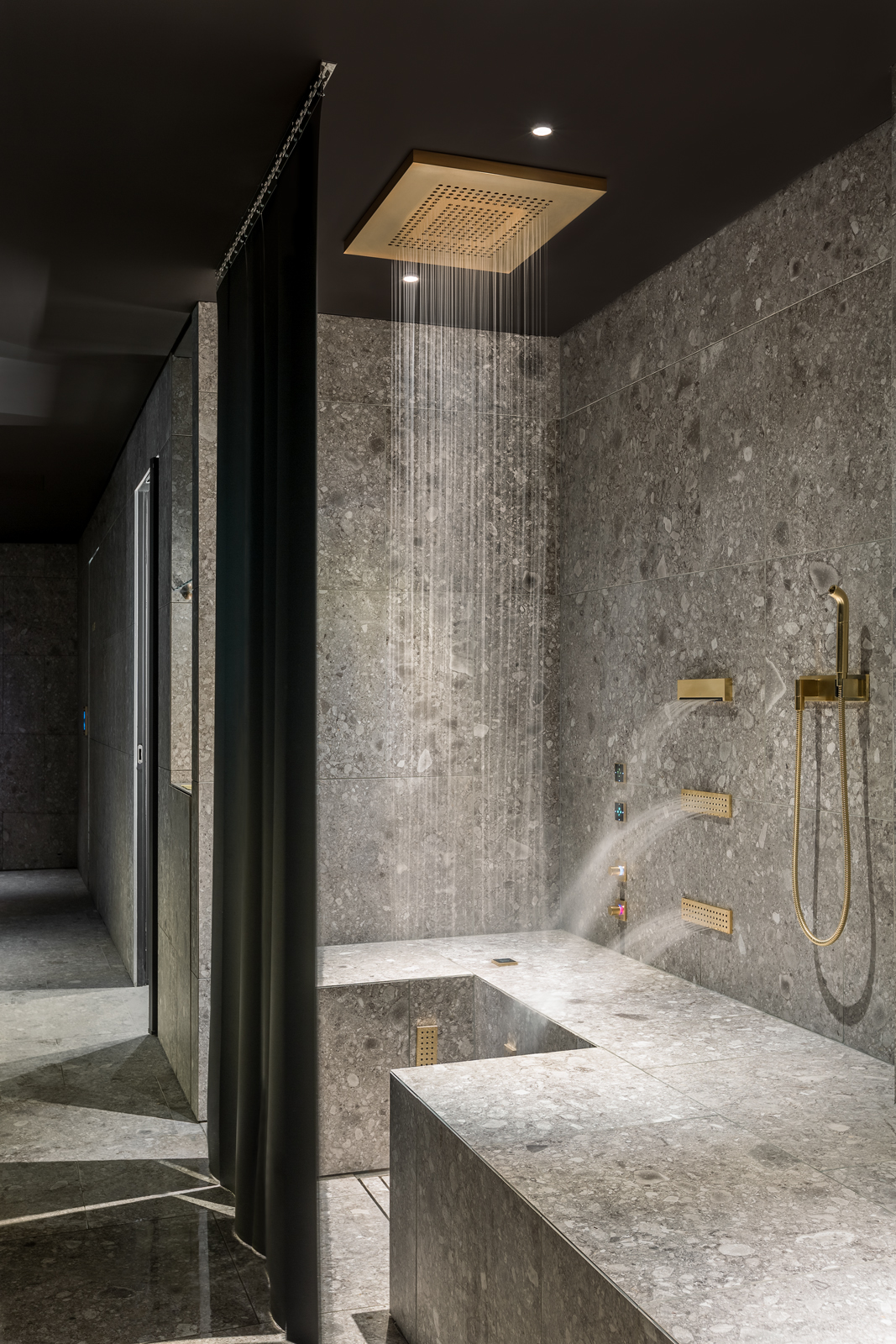 Do Ceresio 7 | Gym & Spa Dornbracht dostarczył m.in. systemy Comfort Shower i Leg Shower wykończone szczotkowanym mosiądzem. Comfort Shower to terapeutyczny prysznic w pozycji siedzącej – silne strumienie wody masują plecy i pomagają rozluźnić mięśnie. Leg Shower to natomiast rozwiązanie dla zmęczonych nóg. Z kolei czarne Sensory Sky oferuje różne rodzaje deszczu, mgły, światła i zapachów. Vertical Shower zainstalowano w strefie beauty. Wstępnie ustawione programy wodne są odpowiednie dla licznych zastosowań w zakresie zdrowia i odnowy biologicznej. Stylową atmosferę Ceresio 7 | Gym & Spa dodatkowo podkreślają baterie i rozwiązania prysznicowe z klasycznej dla marki serii Tara, którą można znaleźć w całym klubie.