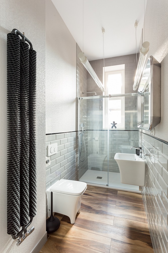 W łazience udało się sprytnie połączyć estetykę dwóch epok. Na ścianach, do poziomu lamperii, zostały położone szare płytki-cegiełki, ponad nimi, biegnąca aż pod sufit, gumowa w strukturze, nowoczesna okleina marki Vescom. Stylizowana ceramika z linii Cow od Art Ceram, a szczególnie charakterna miska WC na fikuśnych nóżkach, została przełamana futurystyczną formą armatury Folded marki Flaminia. Z tej samej oryginalnej linii są wieszaczek na ręcznik oraz uchwyt na papier toaletowy. Folded zainspirowała projektantki do kolejnych odważnych wyborów. I tak