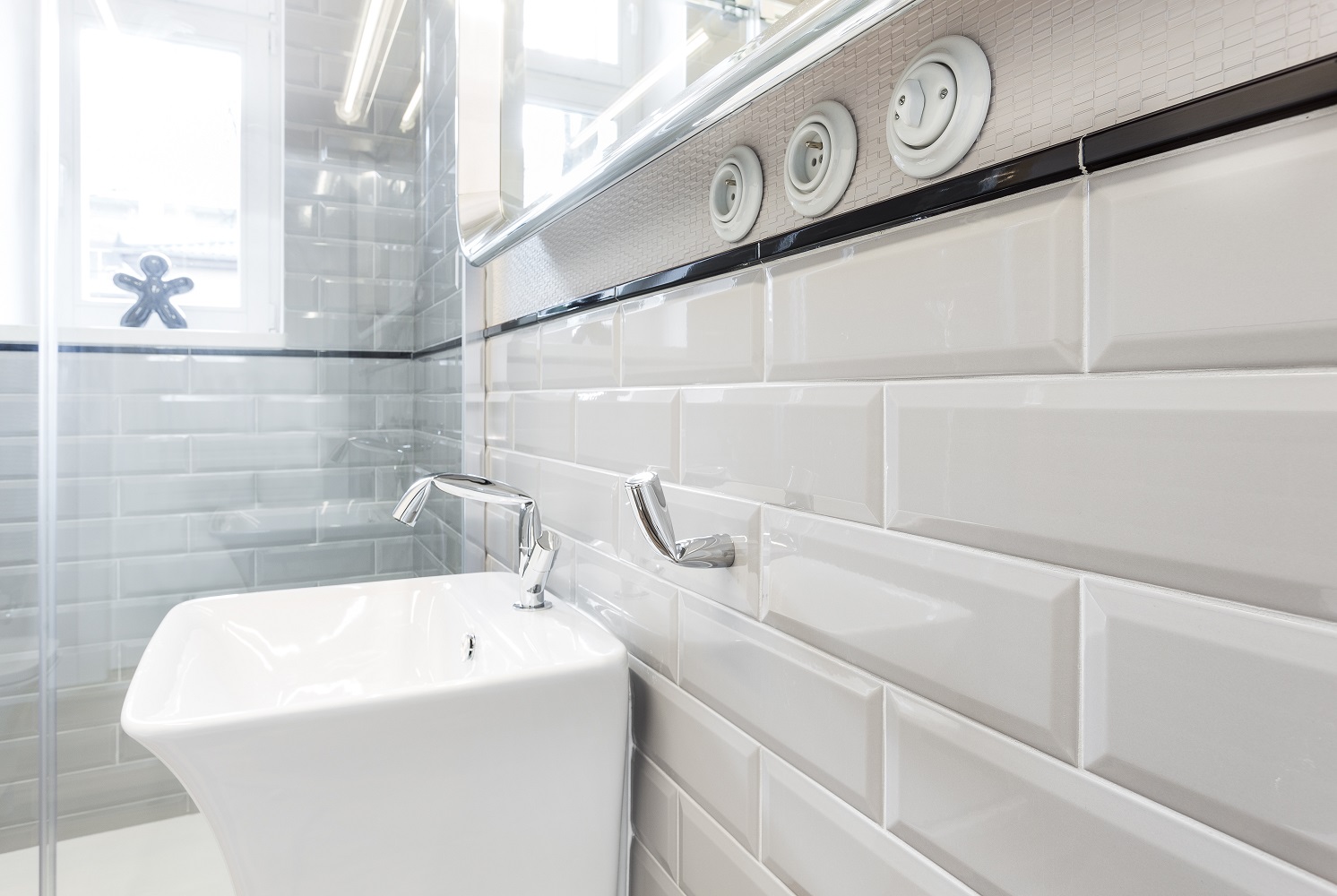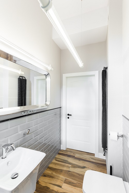 w łazience pojawiły się lustro od Zięta Design oraz futurystyczne tuby opraw oświetleniowych od marki Chors.