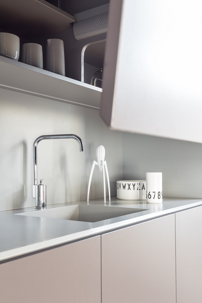 Projektantki rozwiązały ten problem po mistrzowsku i wpadły na genialny pomysł zamknięcia całej kuchni w jednym meblu. A więc na co dzień prosty biurowy kubik, z widoczną jedynie wnęką na ekspres i kilkoma półkami na książki, po otwarciu zmieniał się w funkcjonalną kuchnię ze zlewem, corianowym blatem do pracy i półkami do przechowywania. Dodatkowo projektantka ustawiła go na lustrzanym cokole, który optycznie dodawał mu lekkości i sprawiał wrażenie, jakby unosił się nad podłogą. Prawdziwy majstersztyk.