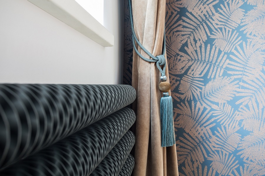 Zarówno właściciel, jak i zespół pracowni Kasia Orwat Design chcieli wprowadzić do nowoczesnego wnętrza akcenty przedwojennego wyposażenia. Dlatego w lokalu pojawiły się stylizowana stolarka drzwiowa, rurowe grzejniki czy porcelanowy osprzęt Busch-Jaeger. Do dawnej świetności mieszkania nawiązują też zakupiona w salonie Dekorian tapeta Harlequin Callista Espinillo, oraz ciężkie, aksamitne zasłony, które niczym kurtyna po rozsunięciu ukazują wspaniałe kadry za oknem – przedwojenne wille zatopione w zieleni.