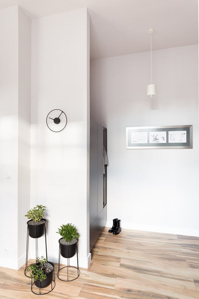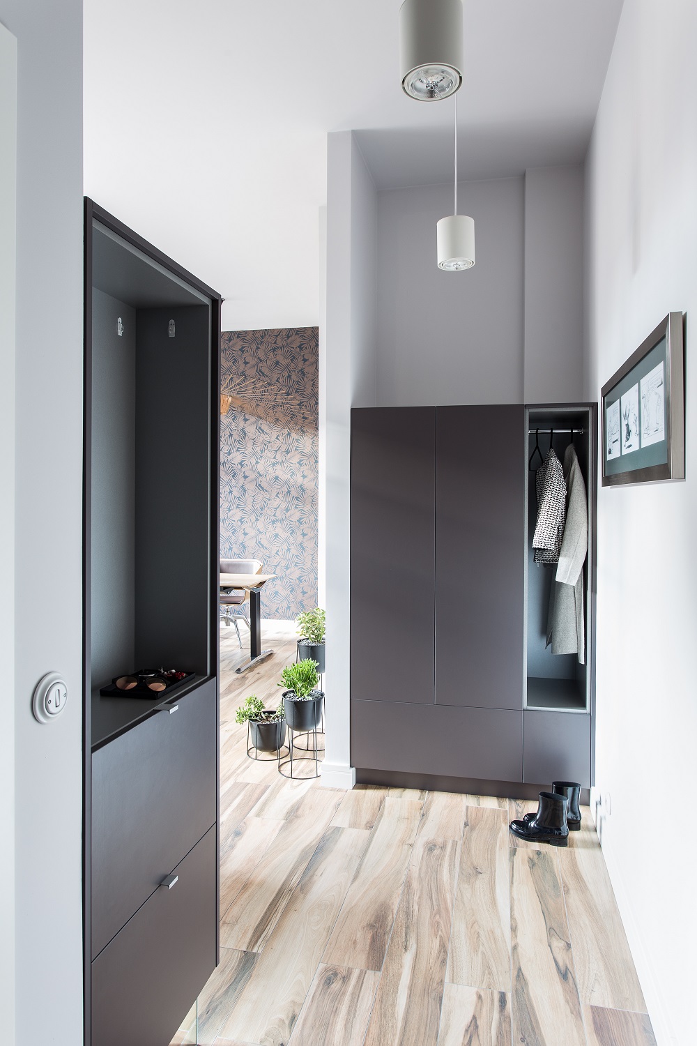 Tworzenie nowoczesnej przestrzeni w starej, historycznej tkance okazało się interesującym zadaniem do wykonania, dlatego projektantki podjęły się go z wielką przyjemnością. Na szczęście mieszkanie w kształcie prostokąta zostało na tyle dobrze zaplanowane przez dewelopera, że nie wymagało większych ingerencji budowlanych. Kosmetyczne zmiany objęły jedynie łazienkę, pomysłowo ukrytą za grubymi nośnymi ścianami, i ograniczyły się do wyprowadzenia nowych punktów wodno-kanalizacyjnych.