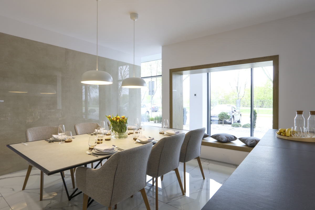 Nowy showroom Tubądzin dowodzi tej myśli. Produkty wielkoformatowe wykorzystano w salonie i jadalni, nie tylko na ścianach i podłogach, ale również jako minimalistyczny blat stołu. Natomiast w kuchni bądź garderobie, tworząc okładzinę meblową.
