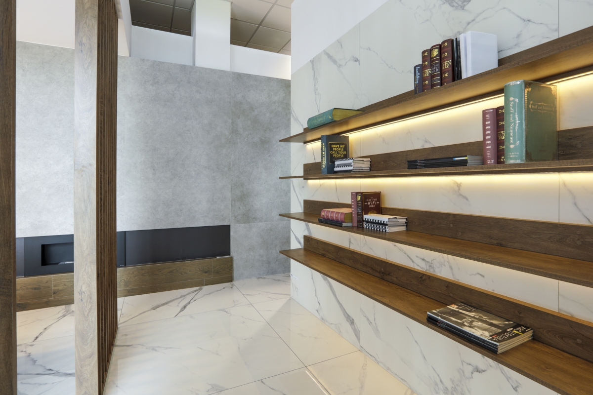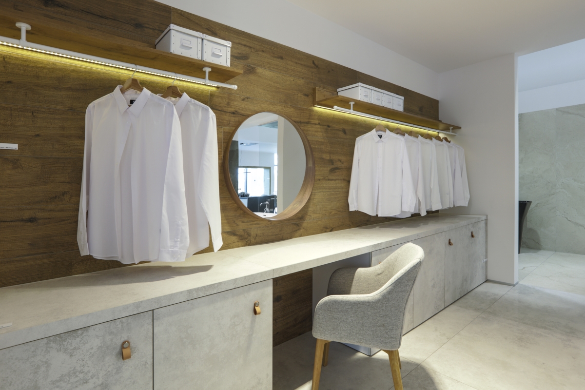 Przestrzeń showroom’u, została podzielona na cztery strefy. Trzy z nich są dedykowane poszczególnym markom: MONOLITH i Korzilius, Ceramika Tubądzin – kreacja Maciej Zień oraz Tubądzin, w której prezentowane są nowości produktowe – płytki w formacie 33×90 cm. Czwarta została przeznaczona na potrzeby architektów i projektantów. Znalazła się w niej także wzorcownia.