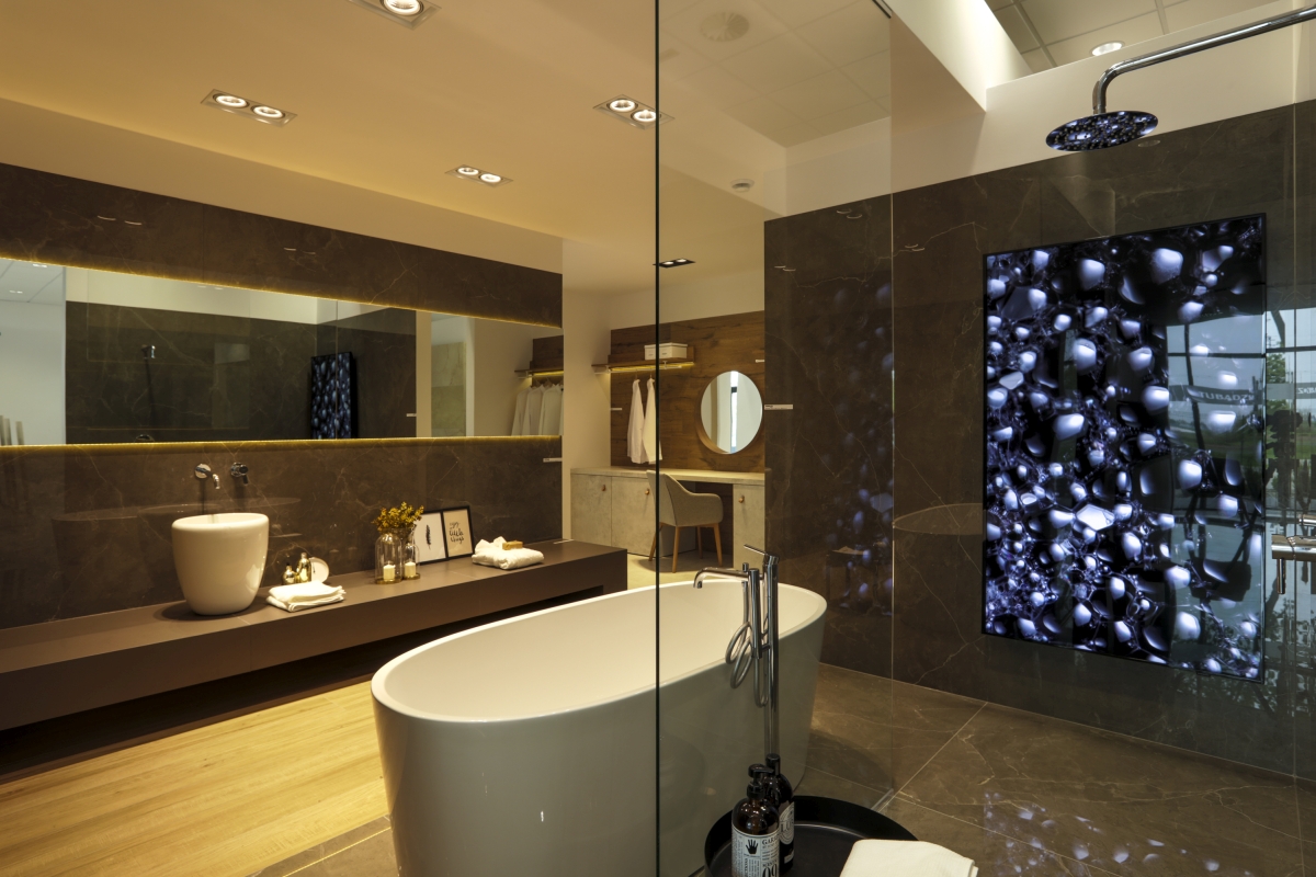 Odświeżona strefa firmowa Ceramiki Tubądzin wygląda jak mieszkanie. Znalazły się w niej wszystkie najważniejsze pomieszczenia tj. łazienka, kuchnia, jadalnia, salon, sypialnia czy garderoba. Każde z nich zostało zaaranżowane z wykorzystaniem wielkoformatowych płyt. Zadbano też o detale – poczynając od muzyki, przez multimedialne impresje, aż po dedykowany zapach, podkreślający charakter marki i oferowanych produktów. Wszystko razem stwarza poczucie wyraźnie odczuwanego komfortu i pozwala odbierać przestrzeń wszystkimi zmysłami.