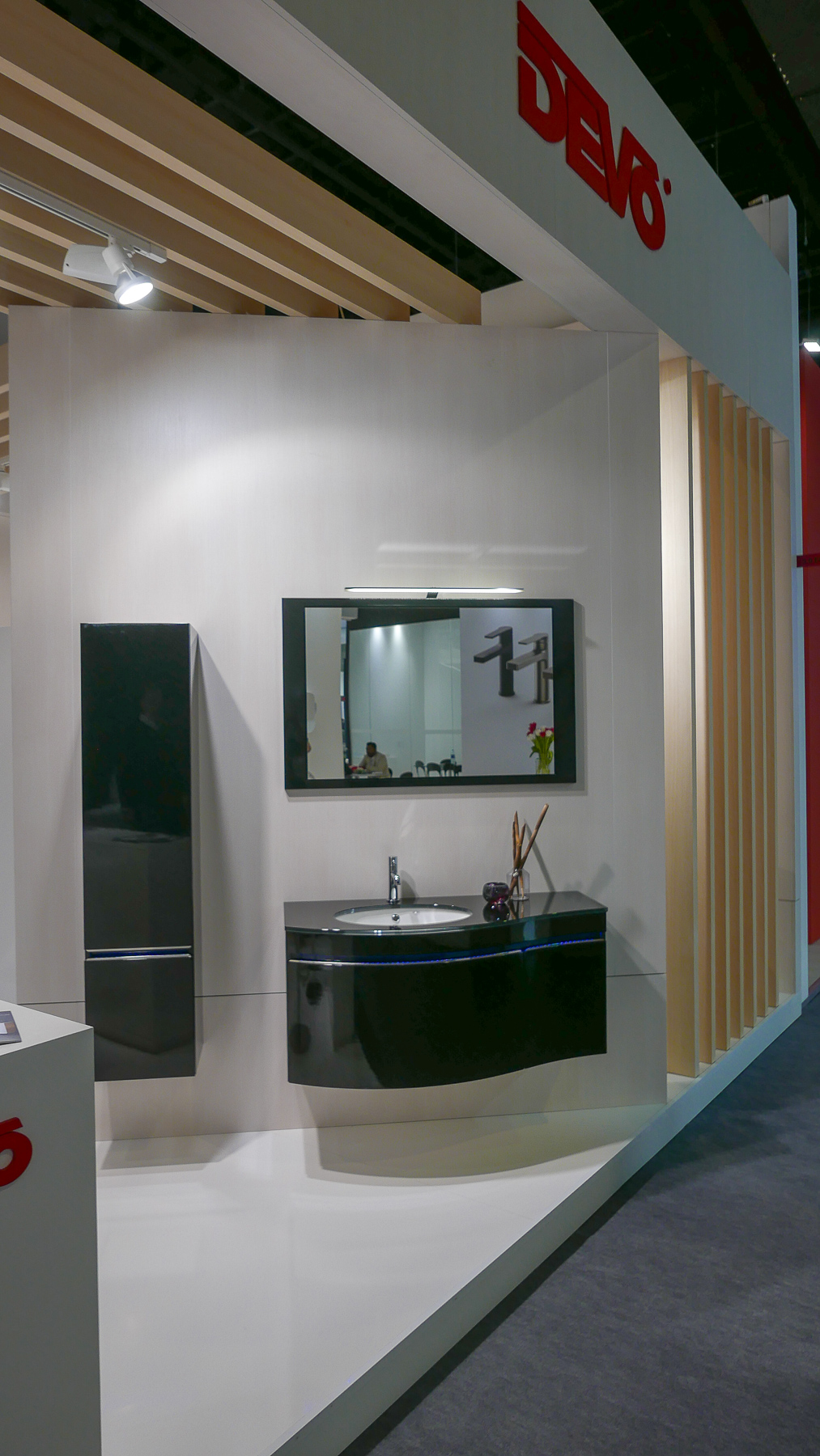 Na tle innych firm na tym piętrze (Laufen, Roca, Kaldewei, Gessi, Geberit, Ideal Standard, etc.) polska firma wystawiająca się z marką Hoesch to rzecz jasna Kopciuszek. Od lat jednak nie próbują się ścigać z sąsiadami, tylko robią coś we własnym stylu, na miarę możliwości. Widać, że skromnie, ale „oddech” można też docenić. W tym roku wyszło to chyba najlepiej – spójnie graficznie, z dobrze dobranymi i rozstawionymi produktami. Rozmiar stoiska i skala jego zapełnienia zawsze wydawały mi się jednak nie do końca zgrane. Mimo to – stosunek ceny do jakości bardzo dobry.