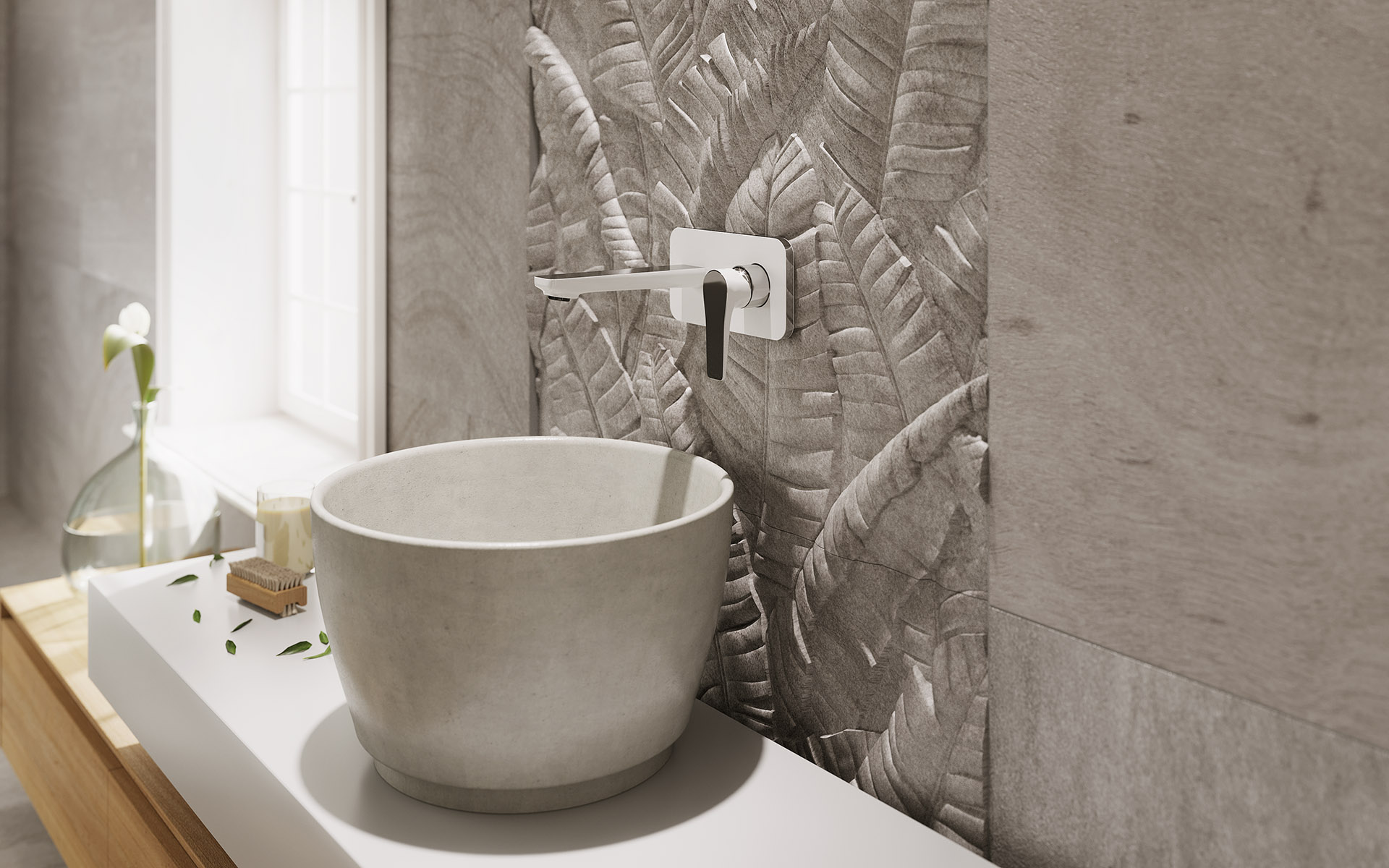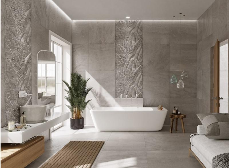 Do stylizacji w gołębich szarościach, z efektownymi pasami z płytek o efekcie 3D w strefie wanny i umywalki, dobrano baterie z serii Adore White/Chrome. To kolekcja, w której ciekawie zestawiono kolory, łącząc stylową, chłodną biel z połyskującą chromowaną powłoką. Jasna barwa armatury dobrze współgra z tłem o trójwymiarowej fakturze, a stonowany design nie przysłania tej bardzo oryginalnej dekoracji ściennej.