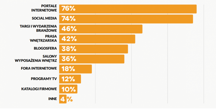 Ciekawe dane przynosi także Raport Sfery Group (dostępny tutaj), z którego wynika, że to także internet jest głównym źródłem inspiracji dla osób, które są zainteresowane aranżacją wnętrz. Aż 76% osób deklaruje, że pomysłów na urządzenie wnętrza szuka w serwisach branżowych, zaś ok. 74% osób w mediach społecznościowych, wśród których króluje Pinterest, a zaraz za nim plasują się Facebook i Instagram. Dużą popularnością cieszą się również magazyny drukowane – chętnie sięga po nie ponad 40% osób zainteresowanych zmianą aranżacji wnętrz.