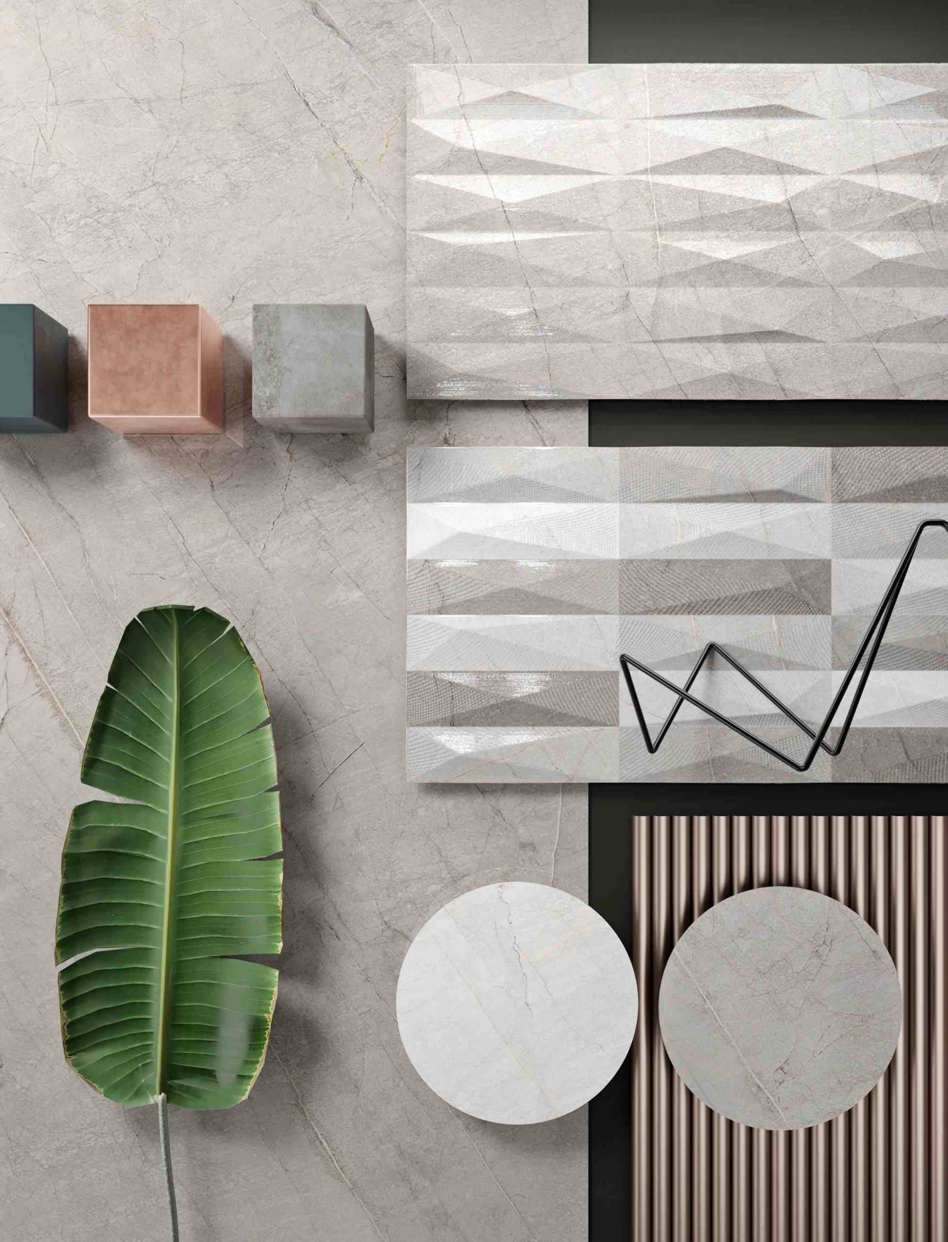 MITCHELL to natomiast miks odcieni szarości i bieli. Efekt tej płytki wzmocniono poprzez delikatne reliefy na jej powierzchni, które podkreślają pozytywną energię całej kompozycji.