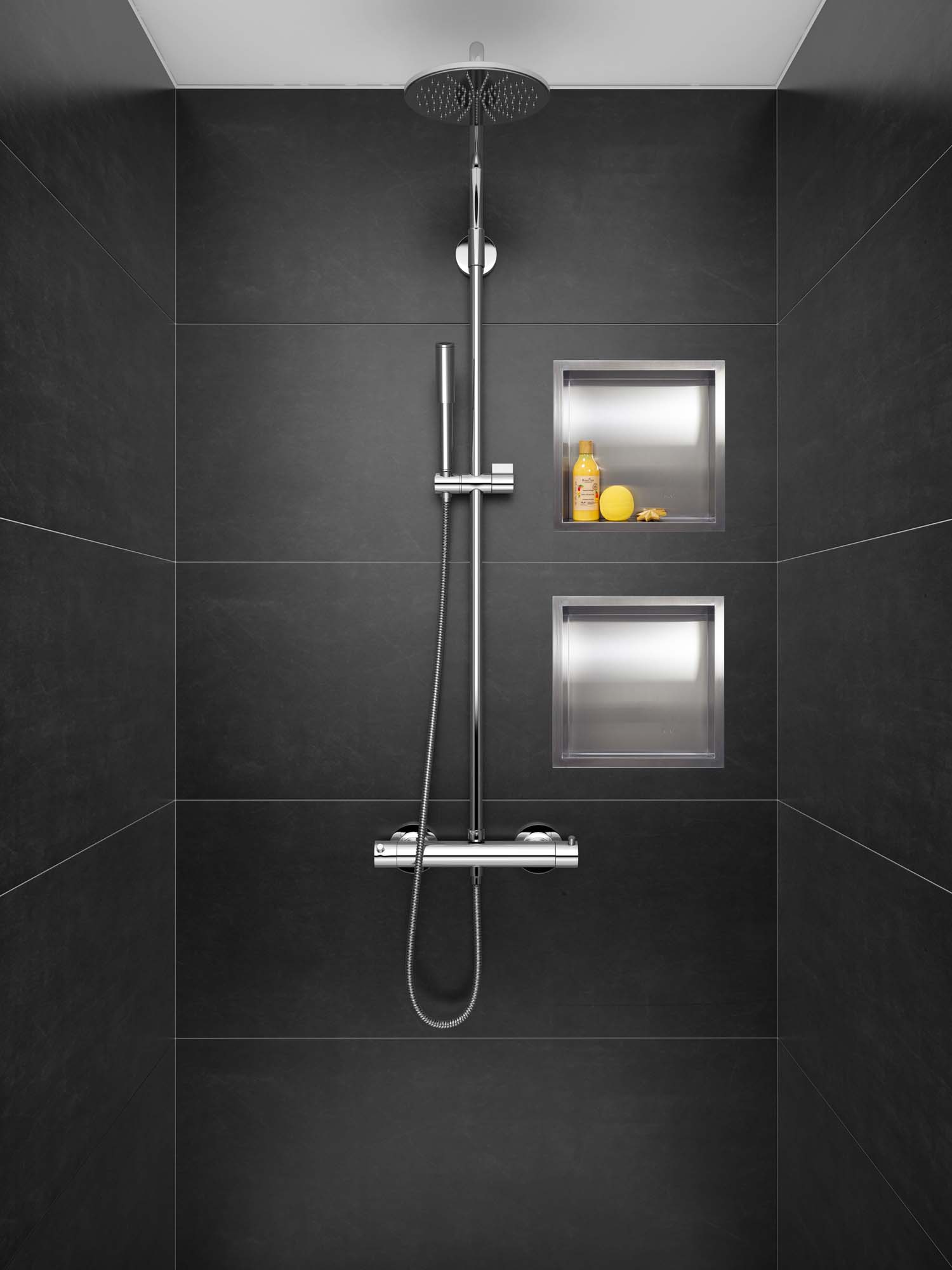Zarówno półki wnękowe, schowki i odpływy liniowe Balneo występują w tych samych kolorach, co daje możliwość dopasowania kompletu do wyglądu danego wnętrza – harmonijnie bądź kontrastowo do przyjętej kolorystyki i wystroju łazienki.