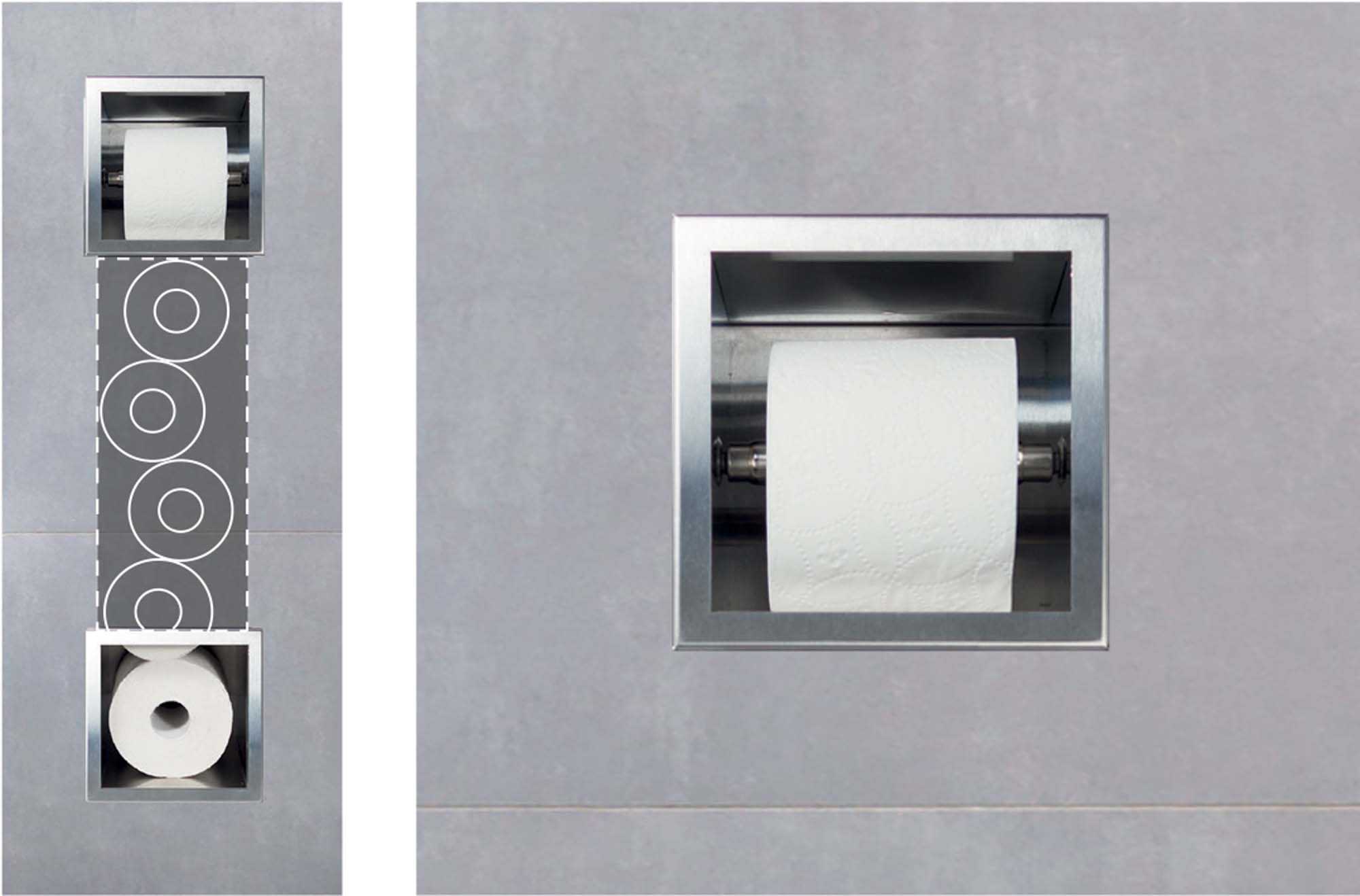 W łazience zapasy papieru toaletowego najczęściej przechowywane są w szaf-kach łazienkowych, ale także w kuchni czy przedpokoju. A przecież nowa rolka powinna być zawsze w zasięgu ręki. Linia produktów Wall-Box Paper rozwiązuje ten problem. To nie tylko klasyczne uchwyty na papier toaletowy, ale również ukryte w ścianie schowki i magazynki do przechowywania, które pozwalają na bieżące uzupełnianie papieru na podajniku.