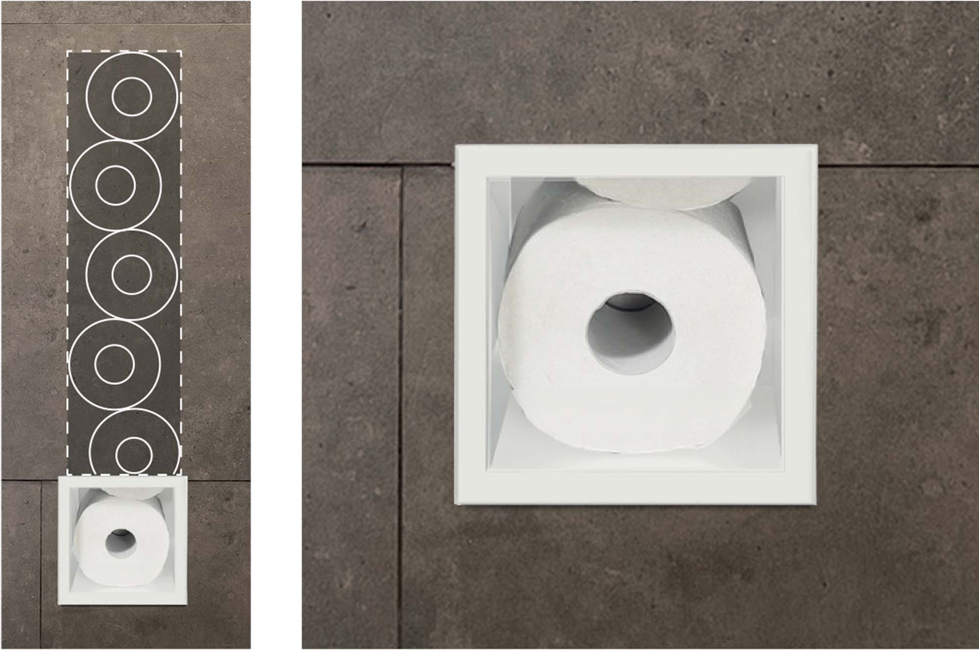 Najprostsza wersja produktu to po prostu uchwyt na pojedynczą rolkę wmontowany w ścianę. Ale już Wall-Box Paper 2 i 3 oferują znacznie więcej i rozwiązują problem z magazynowaniem papieru toaletowego. Choć na pierwszy rzut oka niewiele się różnią od typowej półki, to najważniejsza część ukryta jest w zabudowie, dzięki czemu harmonijnie wkomponowuje się w wystrój łazienki. To rozwiązanie pozwala na wygospodarowanie dodatkowego miejsca, tak potrzebnego na inne przedmioty. Część, w której trzymamy papier toaletowy, jest po prostu schowana. Wall-Box Paper można zainstalować zarówno w ścianie jak i w stelażu podtynkowym służącym do montażu WC. Umożliwi to dostęp do zapasów papieru blisko toalety.