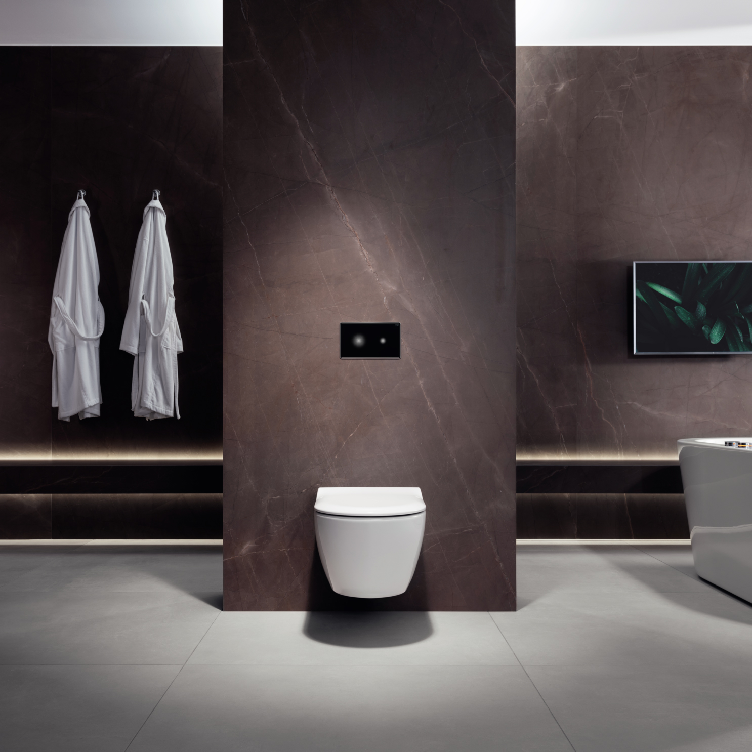 Delikatnie zaokrąglone krawędzie i błyszcząca powierzchnia z czarnego szkła: przycisk Visign for More 205 sensitive przekonuje lekką formą i nowoczesnym wzornictwem. Na przycisku widoczne są dwa podświetlone pola w kształcie pikselowych chmurek. Kiedy zbliżymy się na odległość 250 cm, zaczynają one świecić bardziej intensywnie. Delikatny ruch dłonią aktywuje bezdotykowe spłukiwanie.