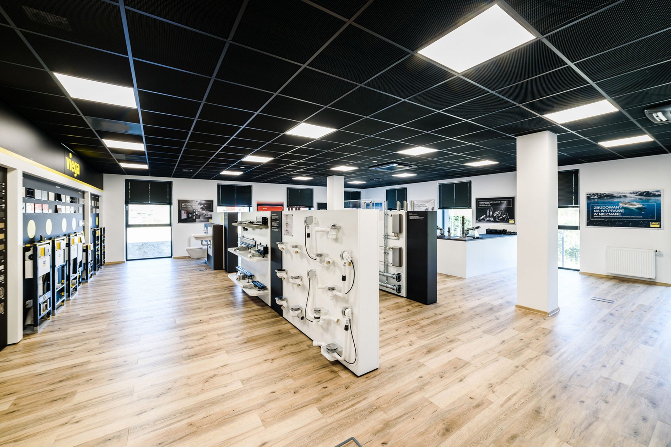 Najważniejszą częścią nowego centrum szkoleniowego jest elegancko zaaranżowany showroom o powierzchni 123 m², gdzie można zobaczyć całą, szeroką ofertę produktów i rozwiązań instalacyjnych Viega, w tym stelaże podtynkowe Prevista, przyciski uruchamiające Visign oraz odpływy Advantix Vario i Advantix Cleviva. Na specjalnych ściankach zaprezentowano fragmenty instalacji wykonanych w systemach zaprasowywanych, takich jak Profipress, Megapress, Sanpress Inox i Smartpress. Uczestnicy warsztatów mają do dyspozycji również wydzielone stanowisko monterskie, przy którym sami wykonują połączenia w technice zaprasowywania. W drugim pomieszczeniu znajduje się komfortowa sala szkoleniowa o powierzchni 33 m², w pełni przystosowana do prezentacji multimedialnych.