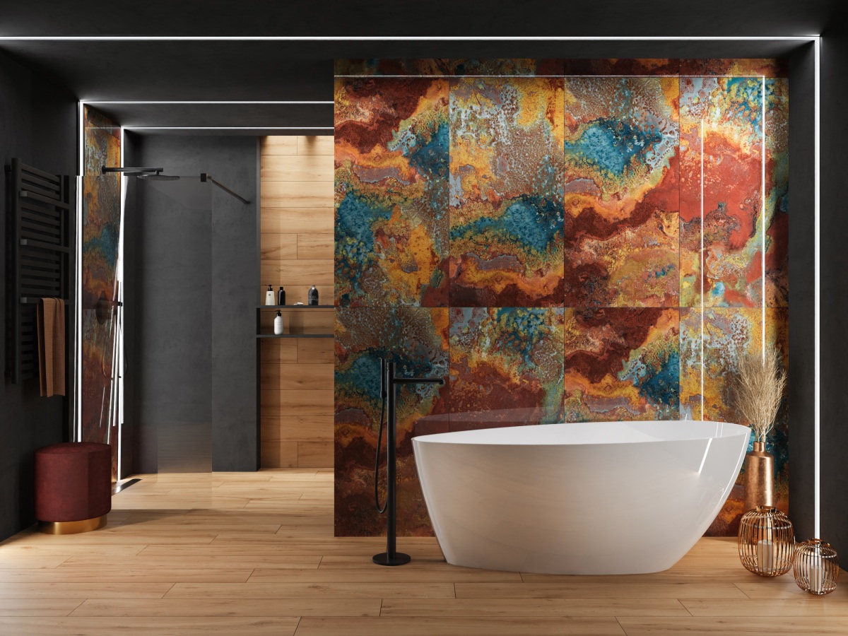 Złoto, brąz, beż – jesienna kolorystyka inspiruje do stworzenia przytulnych aranżacji skąpanych w ciepłych barwach. Coraz dłuższe wieczory często spędzamy relaksując się na kanapie lub biorąc długie kąpiele w wygodnej wannie. Wybierając odpowiednie płytki oraz dodatki możemy zatrzymać wyjątkowy, jesienny klimat w naszym domu na dłużej.
