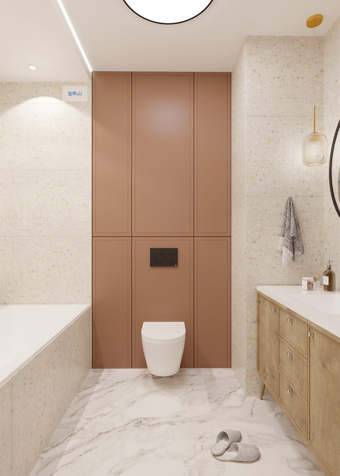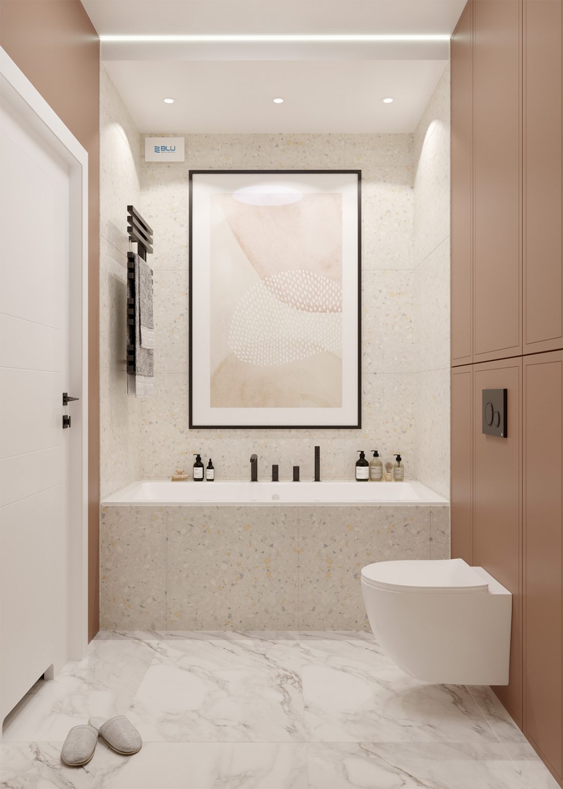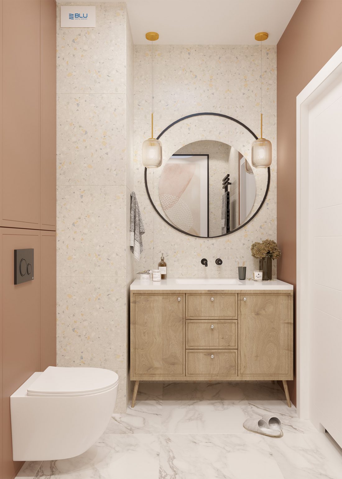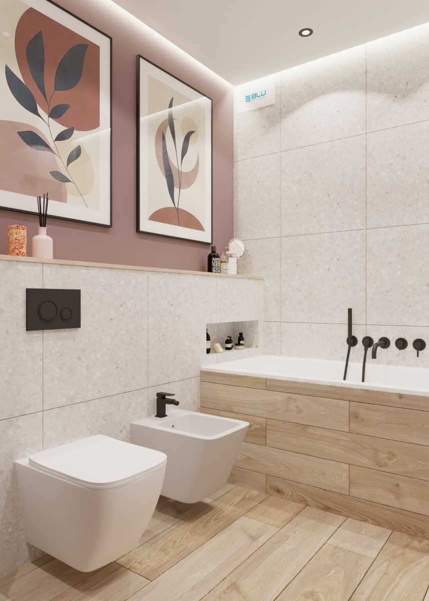 Zastosowanie delikatnego beżu lub lastryko w ciepłym odcieniu sprawi, że wnętrze stanie się bardziej przytulne i domowe. Do tego typu wykończenia bez problemu dopasujemy zarówno białą, jak i czarną lub antracytową ceramikę łazienkową oraz różnorodną armaturę. Jednak sanitariaty to nie wszystko – przestrzeń wykończona w neutralnych barwach pozwoli nam na zastosowanie dodatków w różnych stylach i kolorach dopasowanych np. do aktualnej pory roku.