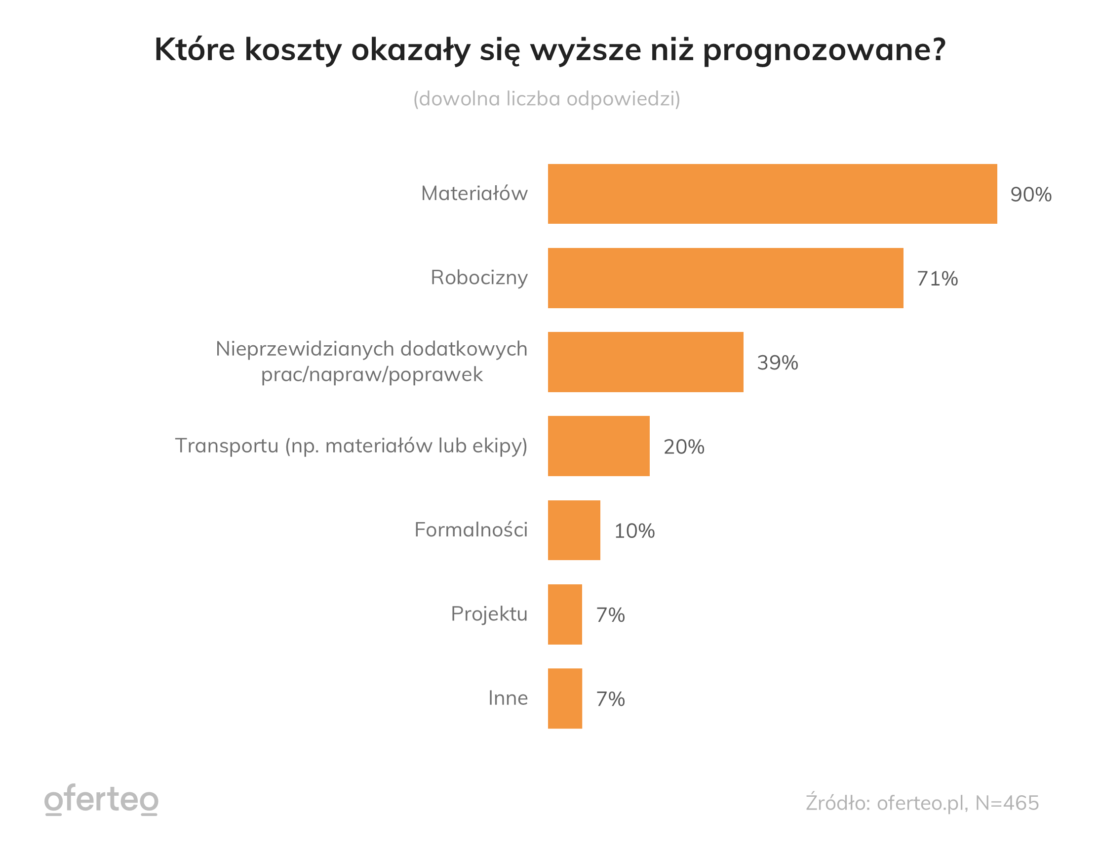 Czasami w trakcie budowy okazuje się, że w wyniku pomyłki czy zdarzeń losowych trzeba opłacić nieprzewidziane wcześniej dodatkowe prace czy poprawki. Koszty tego typu były wyższe niż przewidywane dla 39% inwestorów, którzy przekroczyli budżet. Odnotowano również, że budżet nadwyrężały opłaty związane z transportem (20%), formalnościami (10%) oraz wykonaniem projektu (7%).