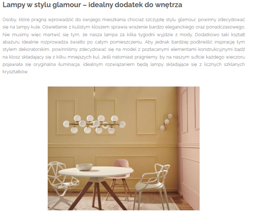 - Oświetlenie wnętrz — omów różne rodzaje oświetlenia w odniesieniu do konkretnych stylów aranżacyjnych. Podpowiedz czytelnikom jak dobrać odpowiednie źródła światła do różnych pomieszczeń.