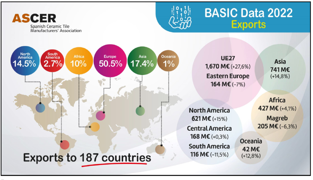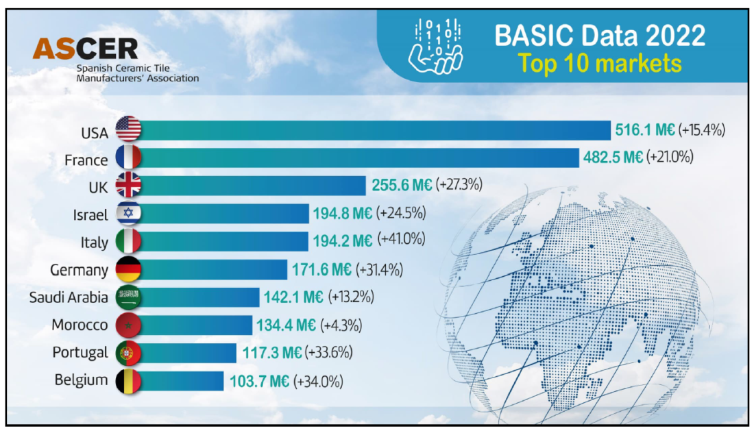 Europa pozostała największym rynkiem dla sektora płytek ceramicznych i odpowiada za 50,5% całego eksportu. Wśród dziesięciu głównych miejsc docelowych sześć to kraje europejskie: Francja (482 mln EUR +21%), Wielka Brytania (255 mln EUR, +27%), Włochy (194 mln EUR +41%), Niemcy (172 mln EUR +31%) , Portugalia (117 mln EUR, +33%) i Belgia (104 mln EUR, +34%). Wszystkie odnotowały dodatnie wzrosty wartościowe, ale nie zawsze pod względem wolumenu (mkw.) Eksport do Stanów Zjednoczonych, które zajmują pierwsze miejsce na liście hiszpańskich rynków eksportowych, osiągnął w 2022 r. 516 mln euro (+15%).