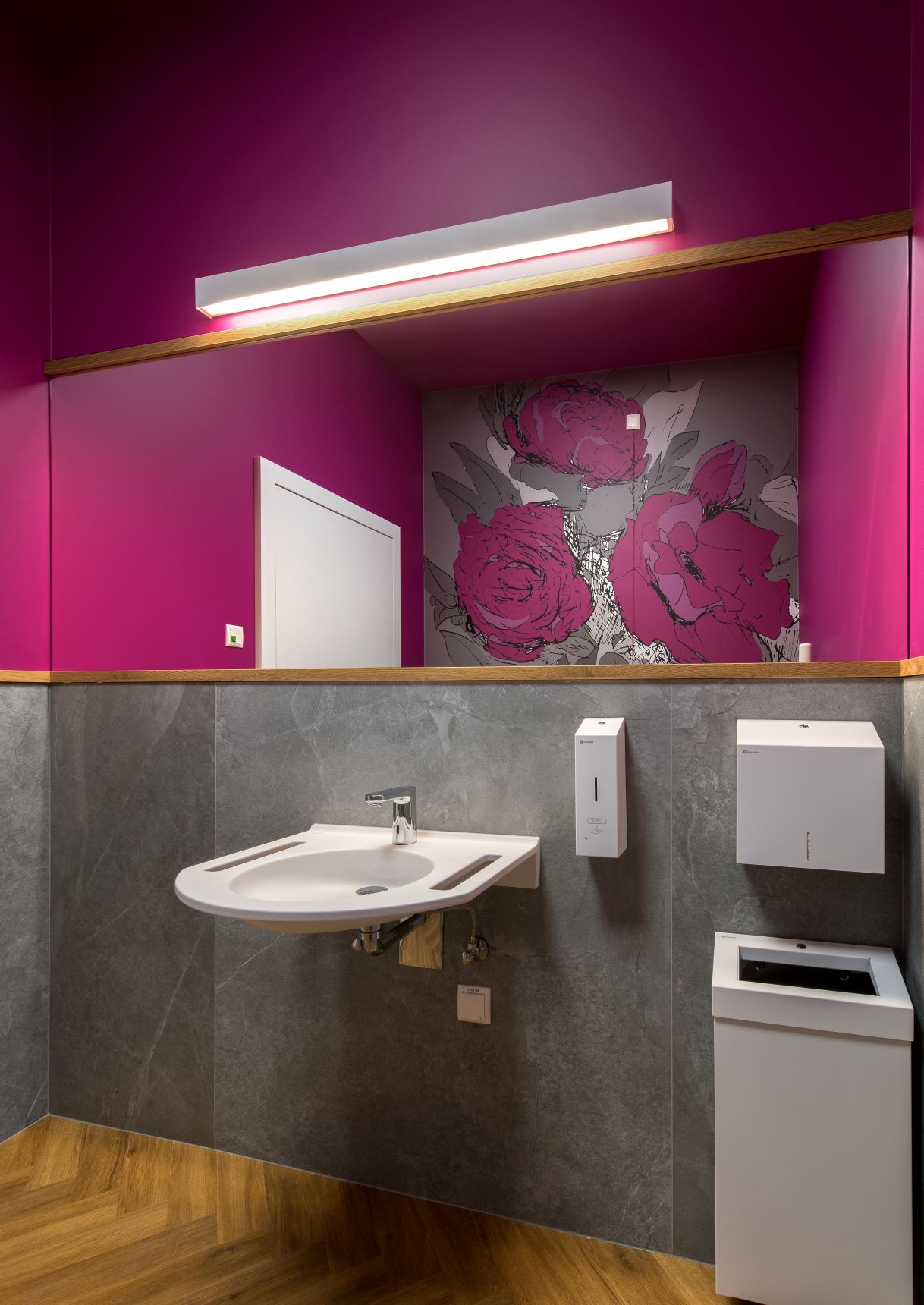Ponieważ do łazienek zagląda się tylko na chwilę, Justyna Smolec nadała im bardzo wyrazisty charakter. To za sprawą dużych płaszczyzn szafiru czy amarantu. W pozostałych wnętrzach oba te kolory stanowią tylko akcenty, jednak stosowane w bardzo świadomy sposób. W salach do rehabilitacji widzimy je nawet w postaci piłek czy tapicerki atlasów, tak by całość była spójna. Nadrzędne znaczenie ma jednak przytulność. Za przykład może służyć szatnia. Wyraźnie odbiega ona od standardowych rozwiązań znanych nie tylko z placówek medycznych, ale nawet z siłowni. Pod względem nastroju najbliżej stąd do atmosfery spa.