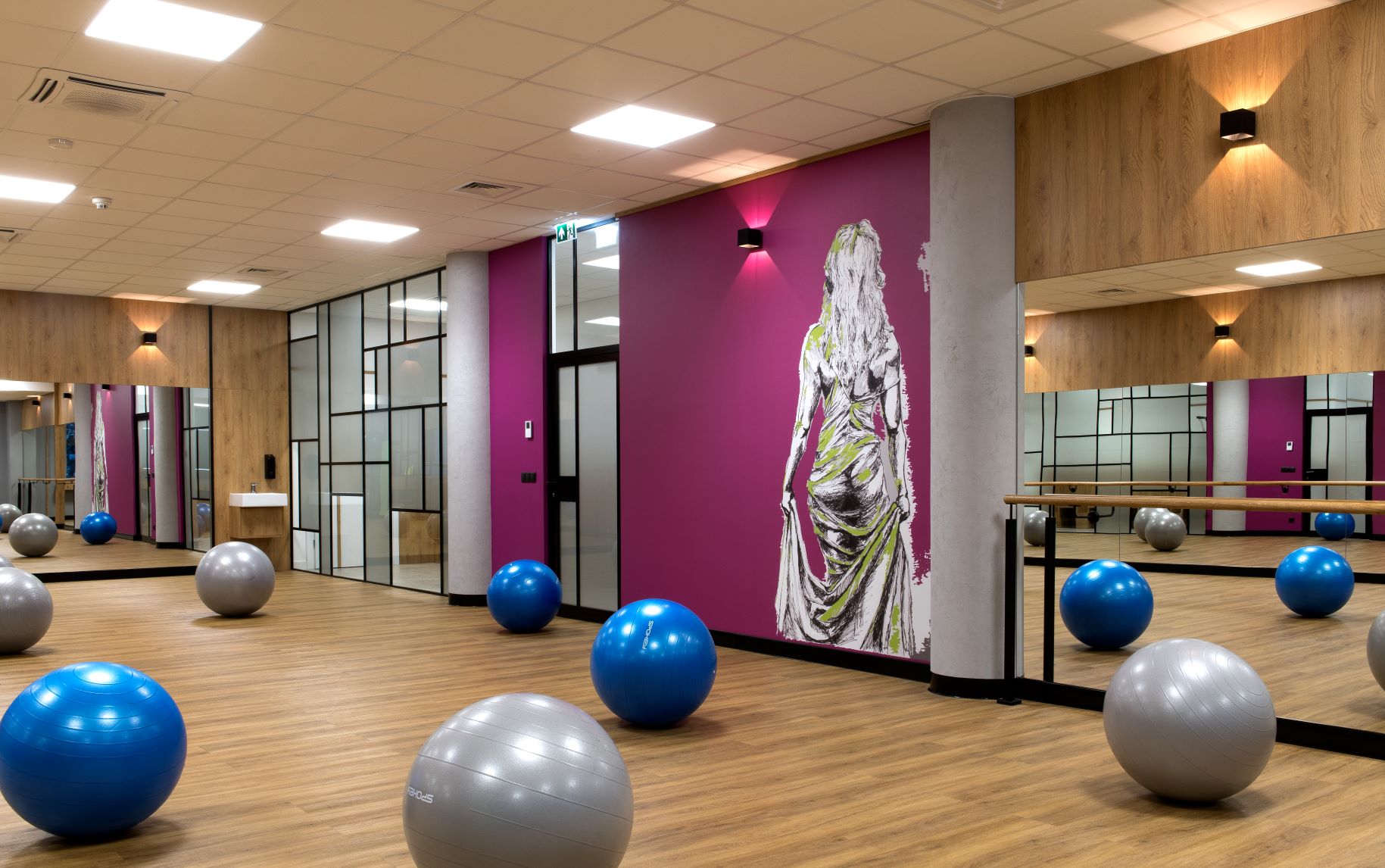 Obok dużych płaszczyzn boazerii czy zabudów (niejednokrotnie z szafirowym lub amarantowym akcentem – jak w przypadku gablot w holu na dole), wątki drewniane we wnętrzach Centrum przewijają się w postaci wąskich listew. Elementy te niekiedy grupują się w zespoły lameli, innym razem opisują ściany cienką kreską. W gabinetach tworzą ramy dla grafik ukazujących budowę miednicy. Tym razem to już nie tylko dekoracja, ale także pomoc naukowa, ułatwiająca pacjentom zrozumienie przebiegu terapii. Na skrzydłach drzwi pojawiają się natomiast po to, by podkreślić opis danego pomieszczenia.