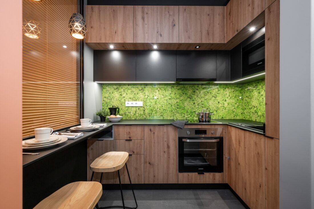 Drewno w parze z czernią całkowicie zdominowały bowiem przestrzeń niedużej, ale bardzo funkcjonalnej kuchni. Zabudowa meblowa, wykonana wg autorskiego projektu architekta przez firmę Komandor, poprowadzona została na planie litery L. Fronty głębokich szafek zdobi płyta laminowana w kolorze Dąb dziki naturalny, pięknie eksponująca naturalny rysunek drewna. Aby maksymalnie wykorzystać dostępną przestrzeń, a jednocześnie jej nie przytłoczyć, znalazł się tu także ciąg płytszych szafek z płyty laminowanej Czerń aksamitna. Ten zdecydowany kolor przerywa monotonię drewna, dodając przy tym głębi i niewyszukanej elegancji. Dlatego też z czarnej płyty wykonany jest dodatkowy blat usytuowany przy oknie… do sypialni. Architekt bowiem, na potrzeby tego niedużego wnętrza, zdecydował się na dodatkowe przeszklenie w ściance oddzielającej oba pomieszczenia. Dzięki temu rozwiązaniu, wnętrze kuchni, chociaż nie posiada bezpośredniego okna, jest dobrze doświetlone. Ten patent zaskakuje oryginalnością i urozmaica wnętrze.