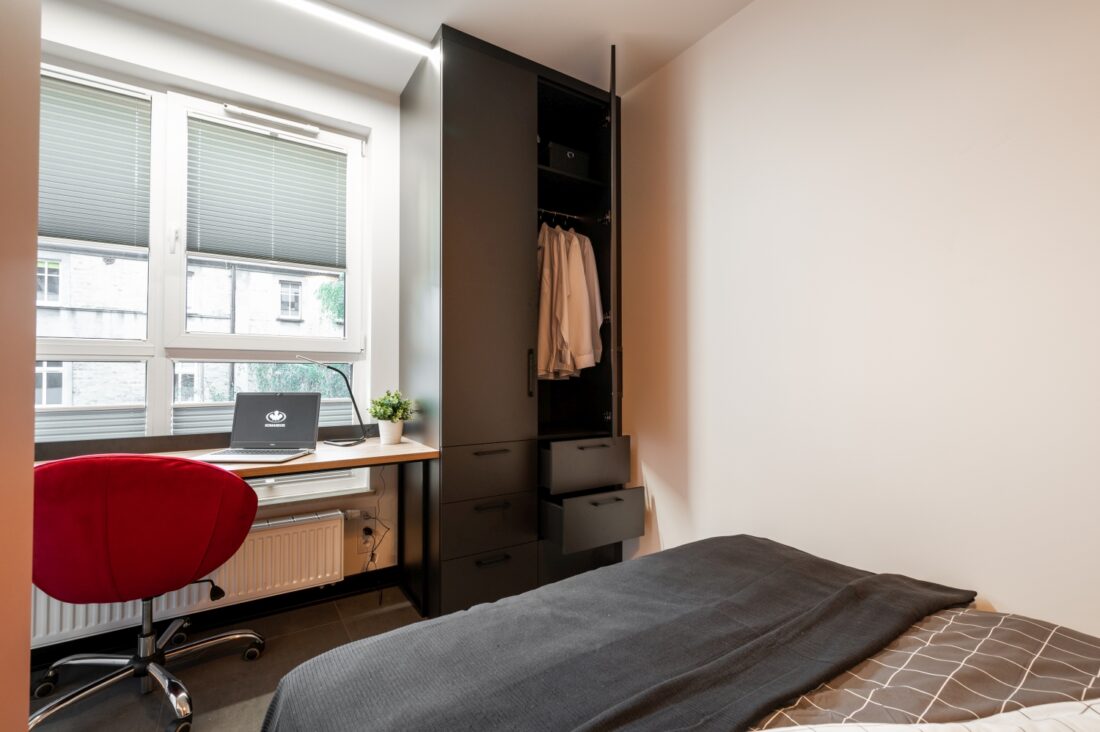 To wnętrze stworzone z myślą o wynajmie. Inwestor chciał, by w tej przestrzeni wygodnie mogły mieszkać dwie osoby. Priorytetem było więc uniknięcie klasycznego podziału na pomieszczenia ścianami i drzwiami, tak by nie zmniejszać optycznie przestrzeni. Stylistycznie mieszkanie ma uniwersalny, ale nowoczesny design, odpowiadający obecnym trendom wzorniczym i funkcjonalnym. Projektowałem tak, by to miejsce spełniało oczekiwania osób aktywnych zawodowo. Ważne było dla mnie jako projektanta kontekstowe zastosowanie kilku wizualnych motywów muzycznych z uwagi na sąsiedztwo Filharmonii Śląskiej. Stąd grafika na centralnej ścianie i ,,muzyczna’’ garderoba