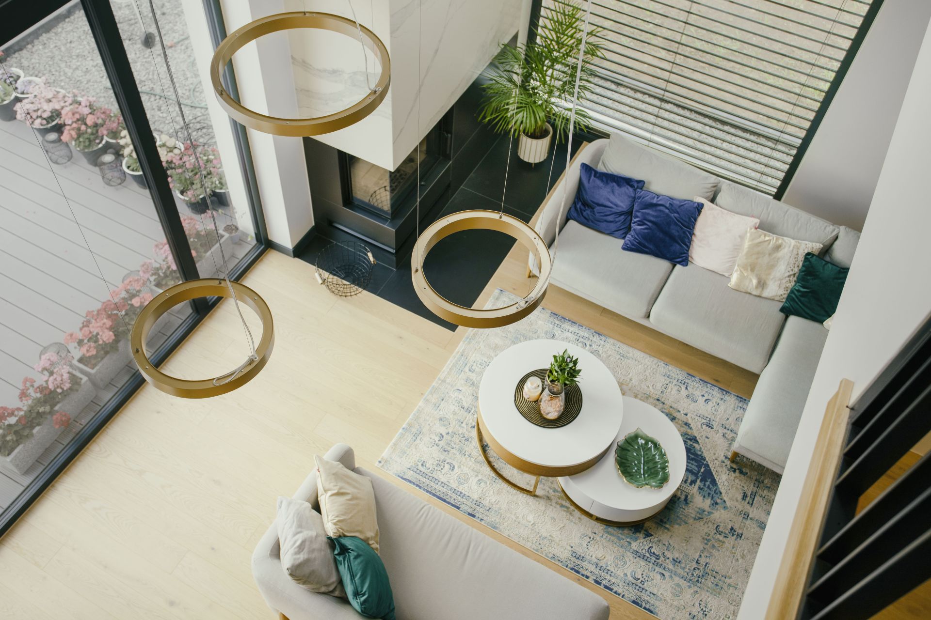 Stąd już krok do otwartego na dwa poziomy salonu. Jego imponującą przestrzeń doświetlają poprowadzone na całej wysokości okna, z których rozciąga się olśniewający wręcz widok na okoliczną przyrodę. To miejsce stworzone do wypoczynku, nie pozbawione przy tym aranżacyjnych smaczków.