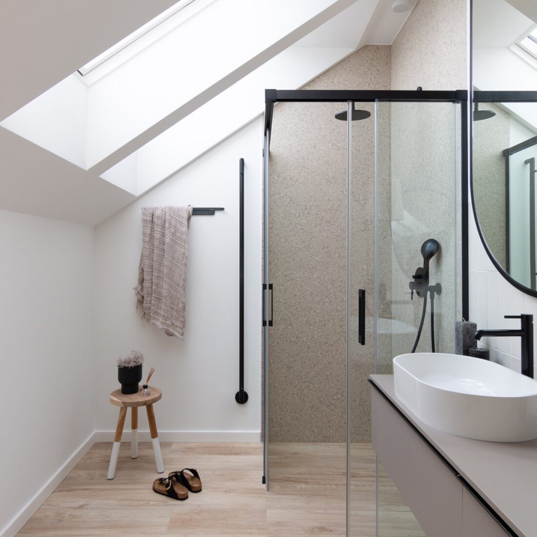 Pierwszoplanową rolę odgrywa tu drewno w bardzo jasnym wybarwieniu, dobrze znane z aranżacji wnętrz inspirowanych stylem skandynawskim. Zdobi on nie tylko podłogi i fronty zabudów stałych, ale też wyeksponowane zostało na fragmentach ścian oraz belkach stropowych, tworząc znaczące tło dla starannie dobranych mebli i dodatków. Te również nie narzucają się ani swoją formą, ani kolorystyką, budując klimat w duchu Zen.