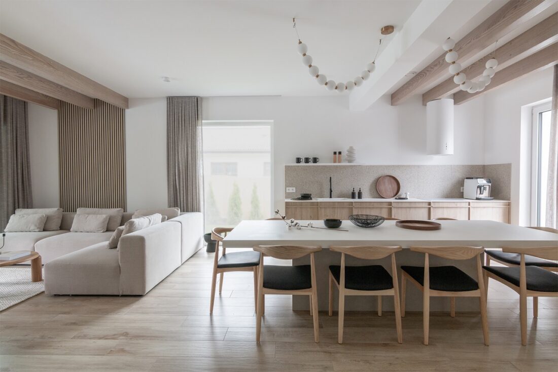 We wnętrzach dominują naturalne materiały skomponowane w skromnej i jasnej gamie kolorystycznej.