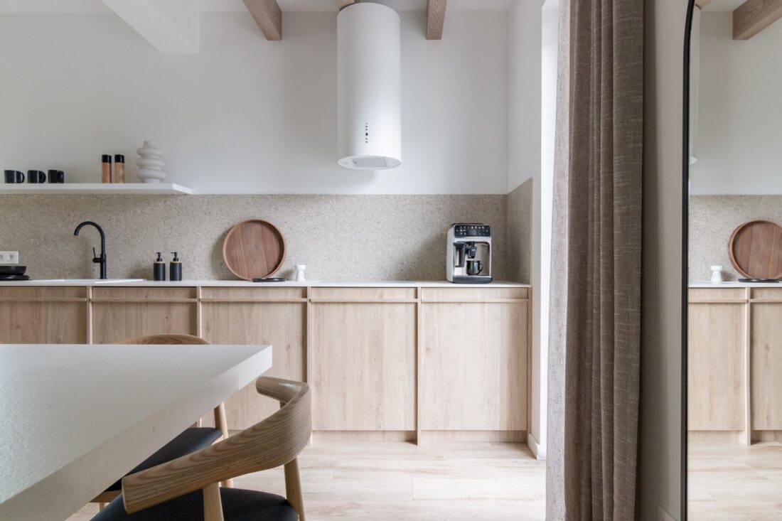 Wystrój wnętrz Japandi Holiday House bowiem doskonale wpisuje się w nadmorski krajobraz, tworząc jedną, spójną całość z tym, co na zewnątrz.