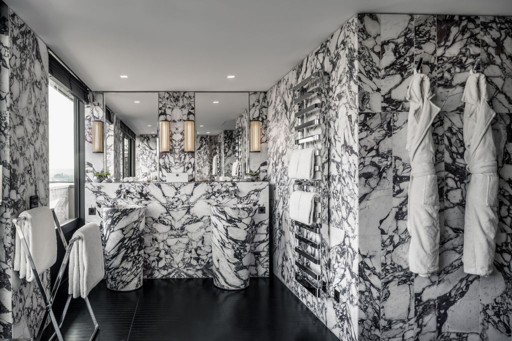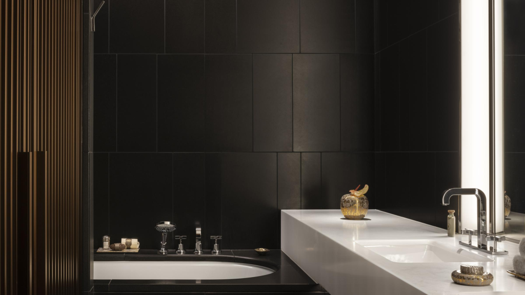 Łazienki w pokojach gości to mistrzowska lekcja włoskiej elegancji z gobelinami o kontrastujących fakturach, monochromatycznymi połaciami marmuru – zielonym z Brazylii, żółtym z Iranu, czerwonym z Sudanu – i ręcznie układanymi mozaikami przedstawiającymi historyczne arcydzieła Bulgari. Ogólny efekt jest niezwykłym przywołaniem historii Rzymu, od łaźni Karakalli i miłości cesarza Augusta do egzotycznych materiałów, po tradycje projektowe Bulgari i XX-wiecznego Rzymu.