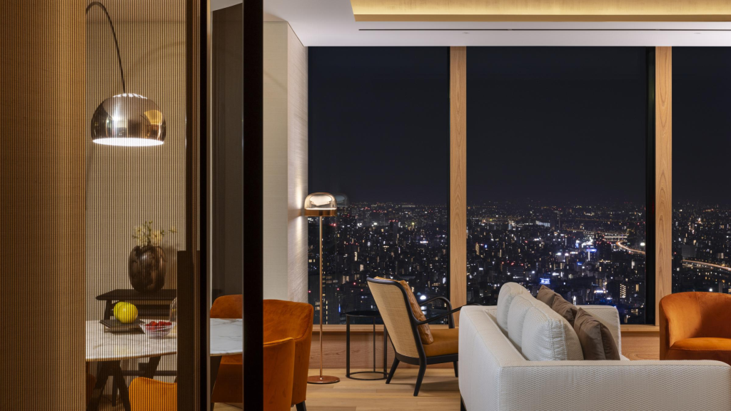 Wewnątrz przestrzeń „ujawnia bardziej kobiecy wymiar japońskiej kultury”, jak wyjaśnia architekt Patricia Viel. Elementy regionalne, w tym spiczaste łuki przypominające świątynie, ręcznie robione meble hinoki i wybór tkanin od działających od wieków producentów tekstyliów z Kioto, uzupełniają charakterystyczne włoskie akcenty – zabytkowe elementy wzornictwa Bulgari i meble zaprojektowane częściowo przez samego Citterio. Żywa paleta pomarańczowego szafranu, czerni i wiązu – materiału głęboko zakorzenionego w lokalnej kulturze – poprawia nastrój gościom.