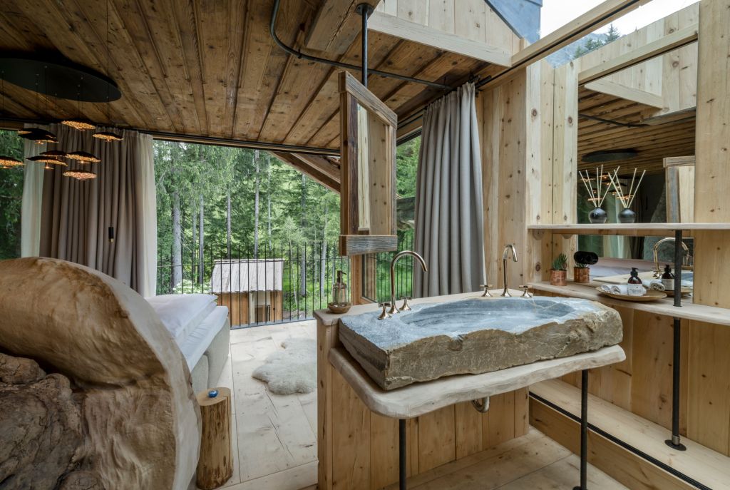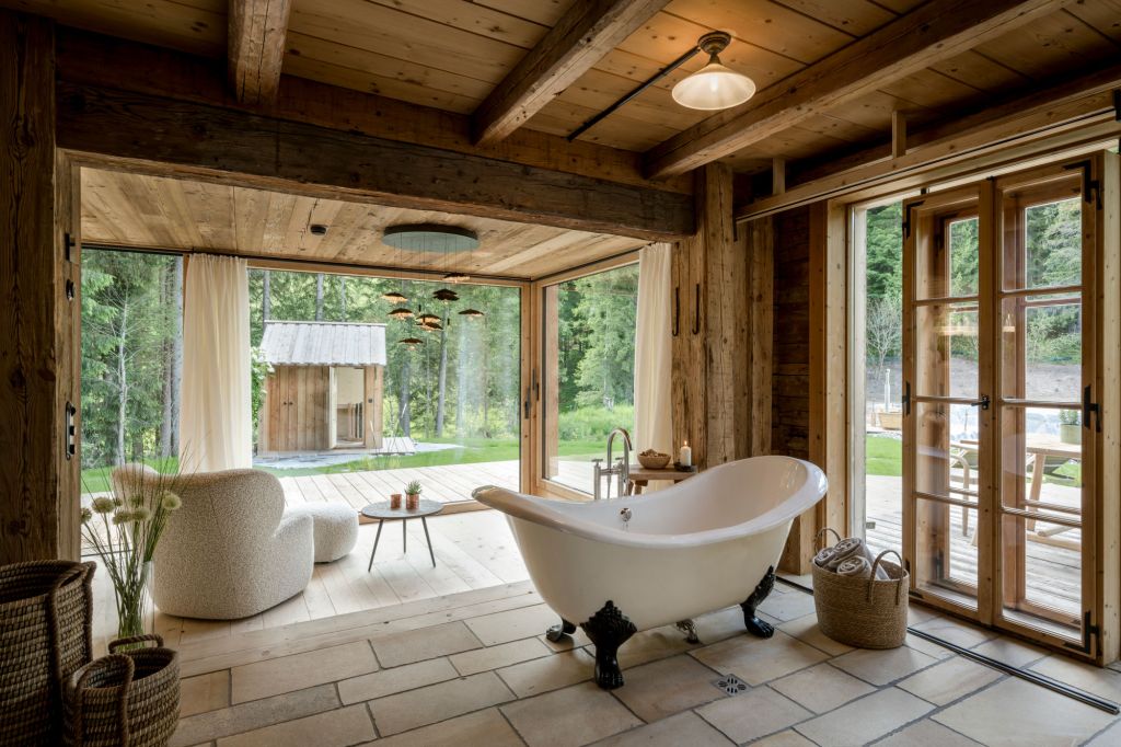 Przy adaptacji chatek nad jeziorem naszą wizją było z jednej strony ukazanie niezwykłej lokalizacji i wspaniałego charakteru najbliższego otoczenia oraz wprowadzenie ich do pomieszczenia poprzez duże szklane powierzchnie. Z drugiej strony chcieliśmy połączyć absolutne poczucie natury z przyziemnym luksusem – mówi Hubert Oberlader, właściciel i gospodarz Priestegg. W porównaniu do wcześniej powstałych domków, nowe obiekty zostały powiększone o około 50 metrów kwadratowych i wyposażone w duże szklane fronty. Znajdują się one bezpośrednio nad naturalnym stawem, który został przekształcony w jezioro kąpielowe i kusi krystalicznie czystą wodą źródlaną. Wnętrze domków odzwierciedla surowy, alpejski urok z jasnymi pokojami i nowoczesnymi elementami wystroju. Otwarta kuchnia płynnie łączy się z jadalnią i salonem. Wykonane na zamówienie rustykalne drewniane meble, puszyste fotele i liczne rośliny tworzą przytulną atmosferę, uzupełnioną wolnostojącą wanną. Towarzyszy jej wolnostojąca bateria wannowa Vaia ze szczotkowanej platyny, zaprojektowana przez Sieger Design dla Dornbracht.