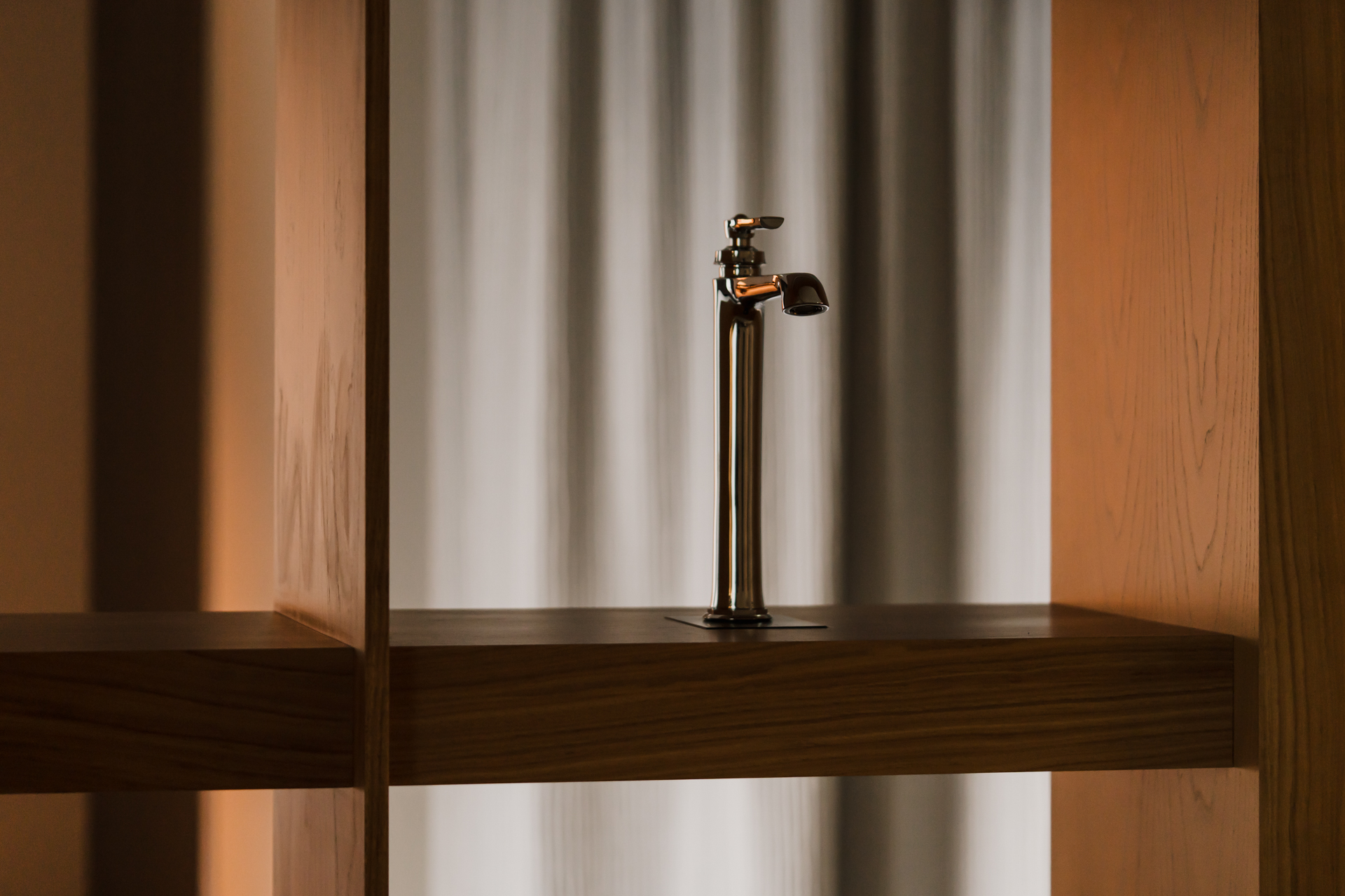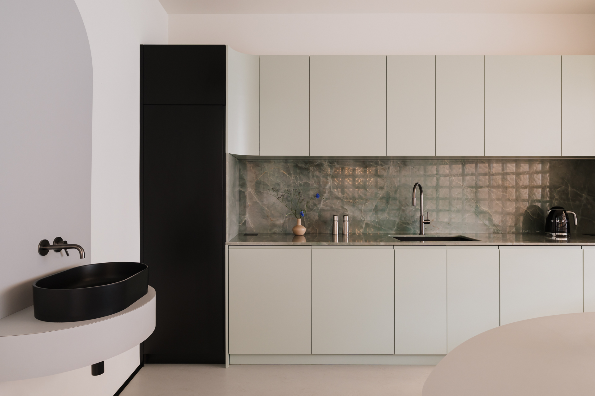 Portfolio produktowe OMNIRES, skoncentrowane na wyposażeniu do łazienek i kuchni, nieodłącznie kojarzy się w wodą, nie dziwi więc bezpośrednie nawiązanie do niej w projekcie. W recepcji można podziwiać unikalny relief przypominający taflę wody, a kuchnia została wyposażona w baterię OMNIRES SWITCH, zapewniającą przefiltrowaną wodę. Minimalistyczna forma i szczotkowane wykończenie baterii doskonale komponują się z pozostałymi elementami wnętrza utrzymanymi w delikatnych odcieniach szałwii i szarości.