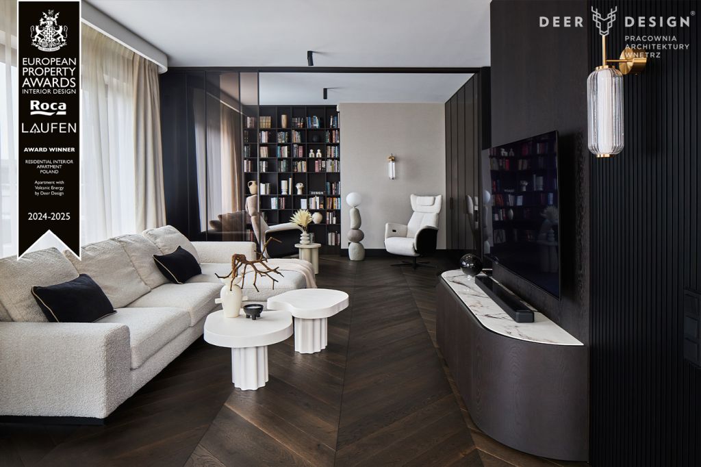 Nagrodzony projekt Deer Design to „Apartament z wulkaniczną energią”, zrealizowany dla prywatnej inwestorki w Warszawie. Koncepcja zdominowana jest przez ciemne kolory, które przywołują skojarzenia z energią wulkanu. Wnętrze jest jednak wyjątkowo ciepłe i estetycznie wyrafinowane. Stylistyka 130-metrowego apartamentu idealnie odzwierciedla osobowość i temperament właścicielki: kobiety biznesu, entuzjastki sztuki i designu. Projekt stworzony przez Julitę Bojańczyk we współpracy z Anitą Szymańską, to idealny przykład wsłuchania się w potrzeby inwestorki i siły kooperacji.