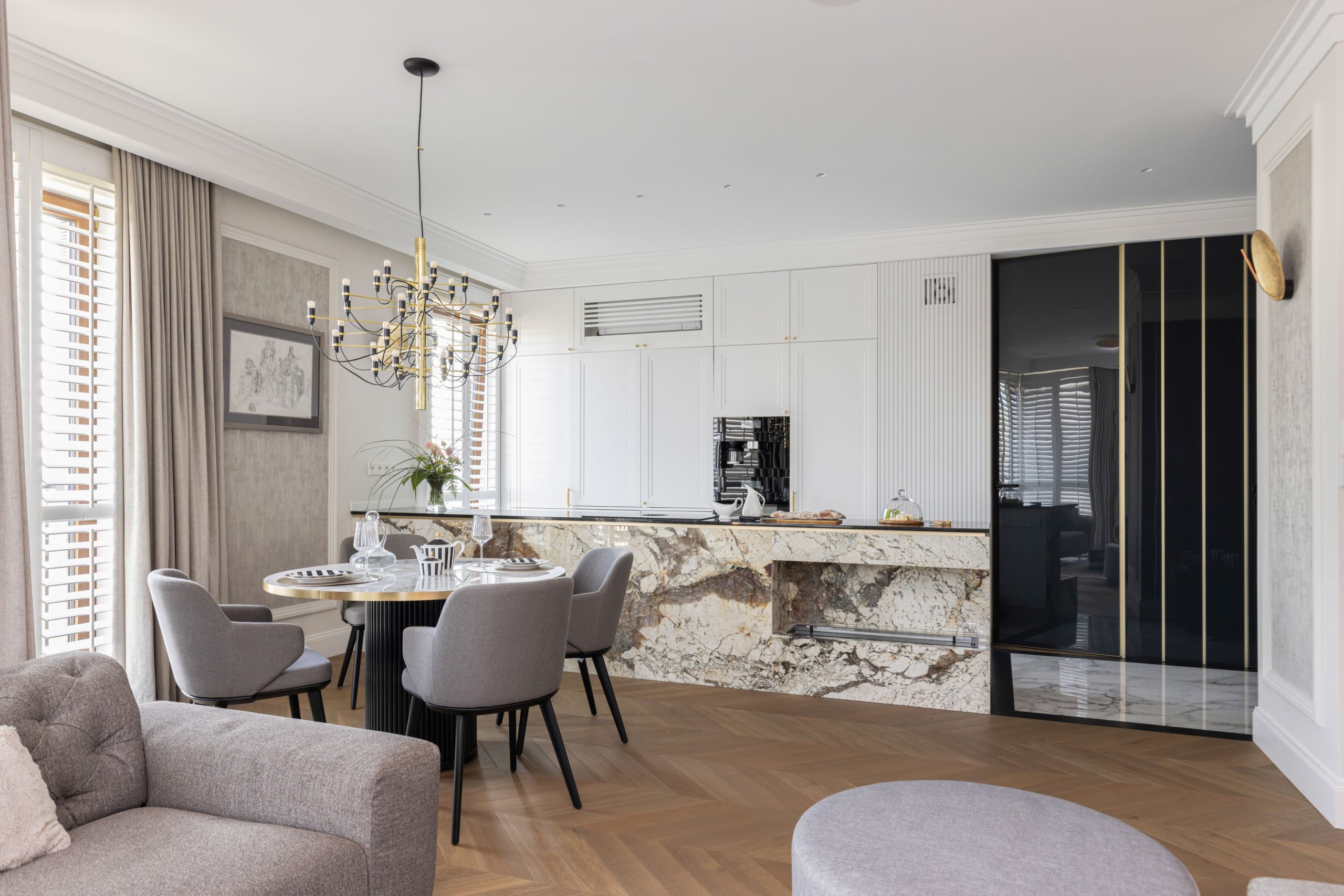 Ten apartament od pierwszego kroku komunikuje swoją tożsamość. Jest elegancki, dopracowany i spokojny, a jednocześnie wyraźnie podzielony na role, jakie ma pełnić na co dzień. To przestrzeń życia rodzinnego, ale też miejsce pracy i spotkań – zaprojektowana tak, by granice między tymi światami były czytelne, choć niewidoczne na pierwszy rzut oka.