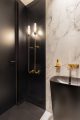 Wykończenie wnętrza opiera się na ponadczasowej elegancji marmuru, który w połączeniu z jasną bazą i lustrzanymi płaszczyznami buduje wrażenie szlachetności i ładu. Ciepłe akcenty złota wprowadzają zaś nutę luksusu i wyrafinowania. Istotną rolę odgrywa tu armatura, dobrana z dużą świadomością zarówno estetyczną, jak i funkcjonalną. Przy umywalce zastosowano baterię AXOR Citterio M – kolekcję o miękkiej, architektonicznej linii, która łączy nowoczesną formę z ponadczasową elegancją.